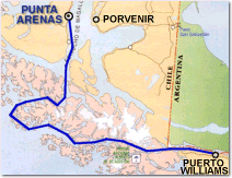 This is a beautiful trip from Punta Arenas, through the Strait of Magellan, through the fjords and along the Beagle channel to Puerto Williams. The company that offers this boat-trip is called Austral Broom.